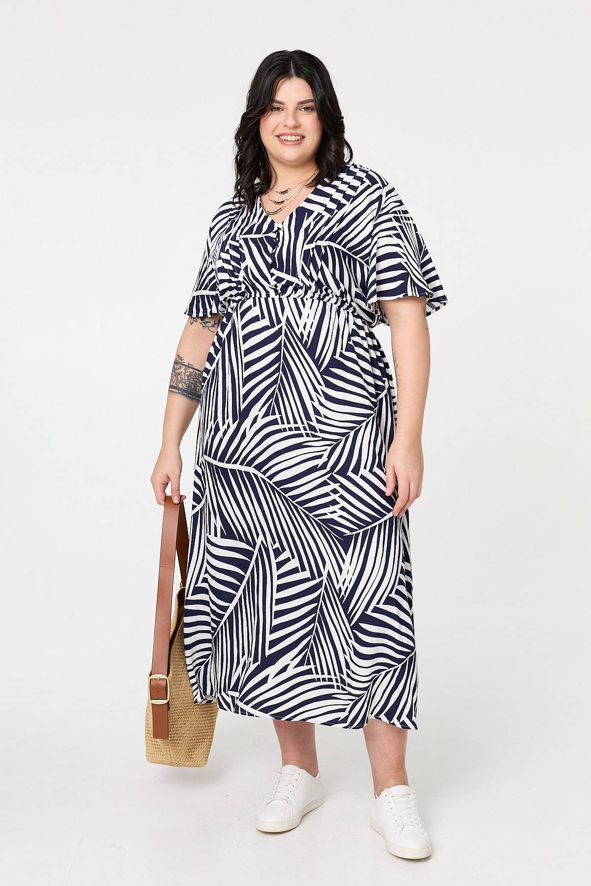 Curve Leaf Print Short Sleeve Midi Dress