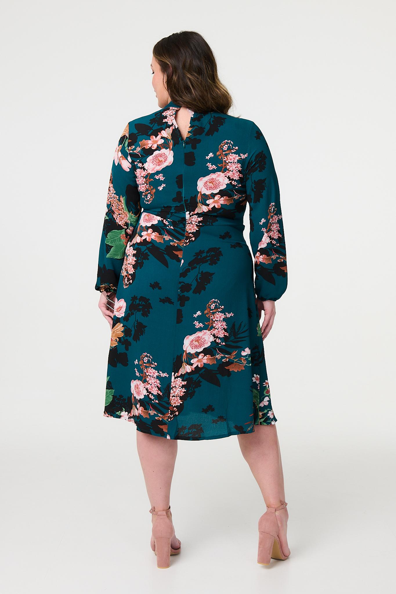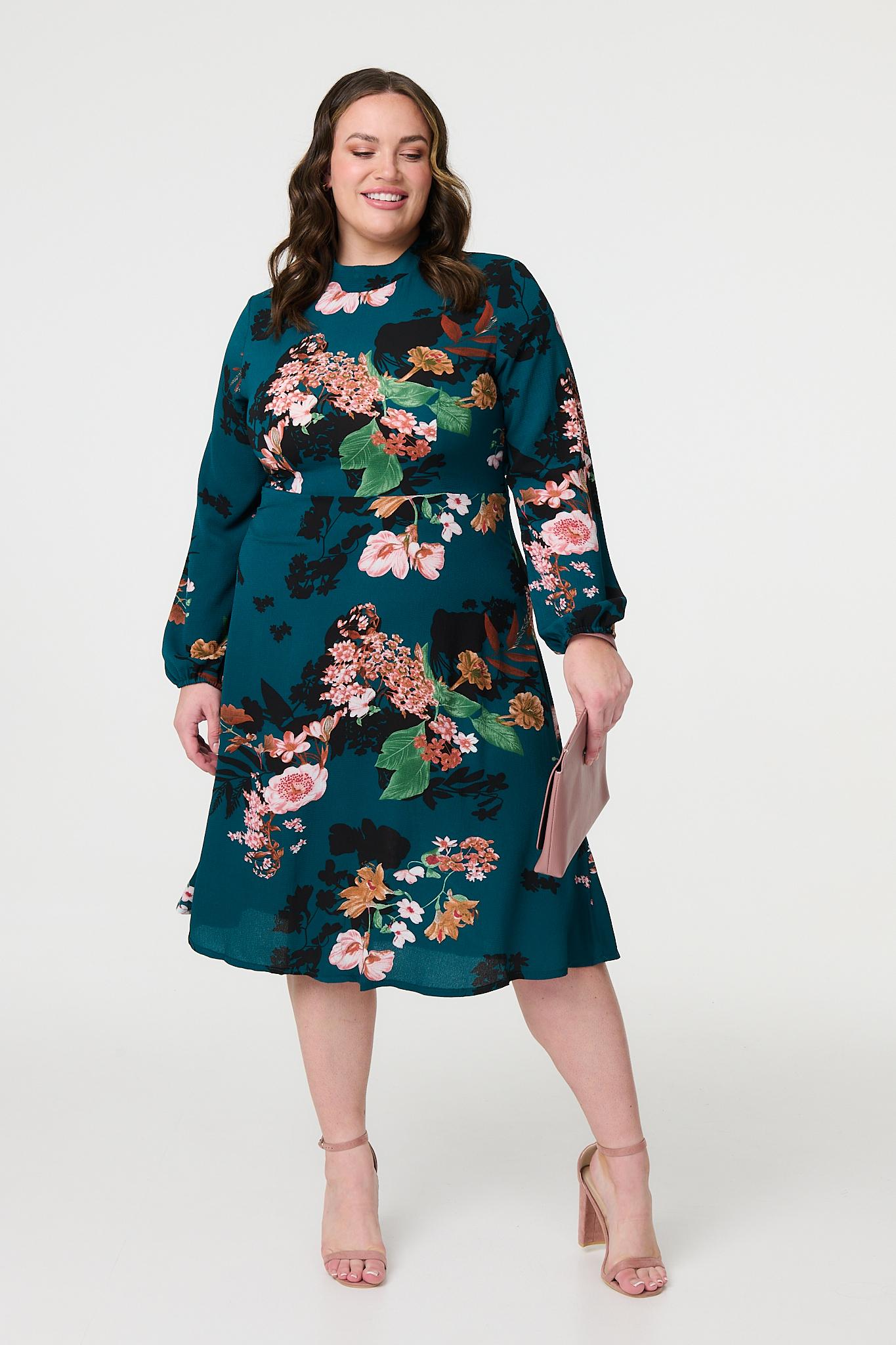 Get an elegant look with this flattering a-line midi dress. It has a high neck shape, a keyhole button fastener on the back, and long balloon sleeves. The sleek a-line shape is designed to suit every figure, so you can wear this dress for special occasions and smart dress codes.