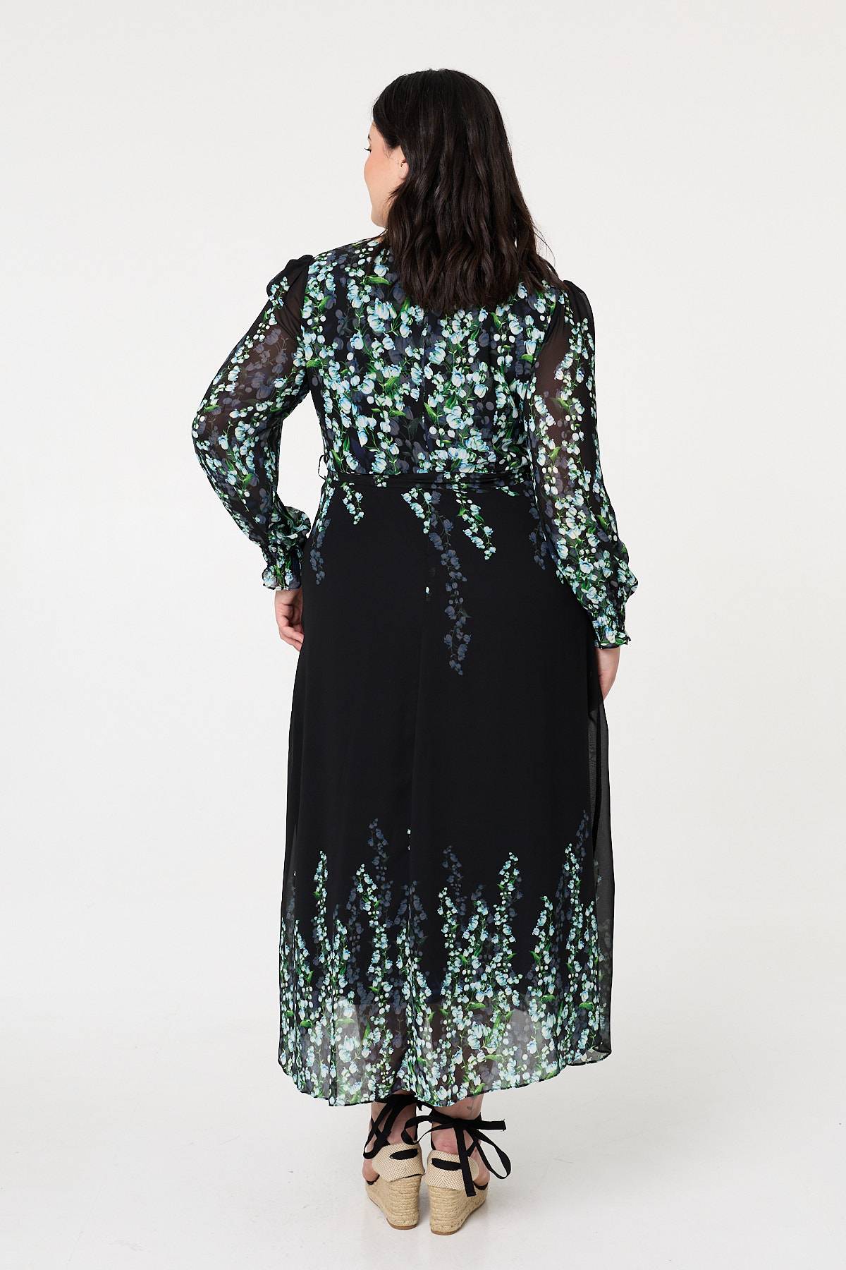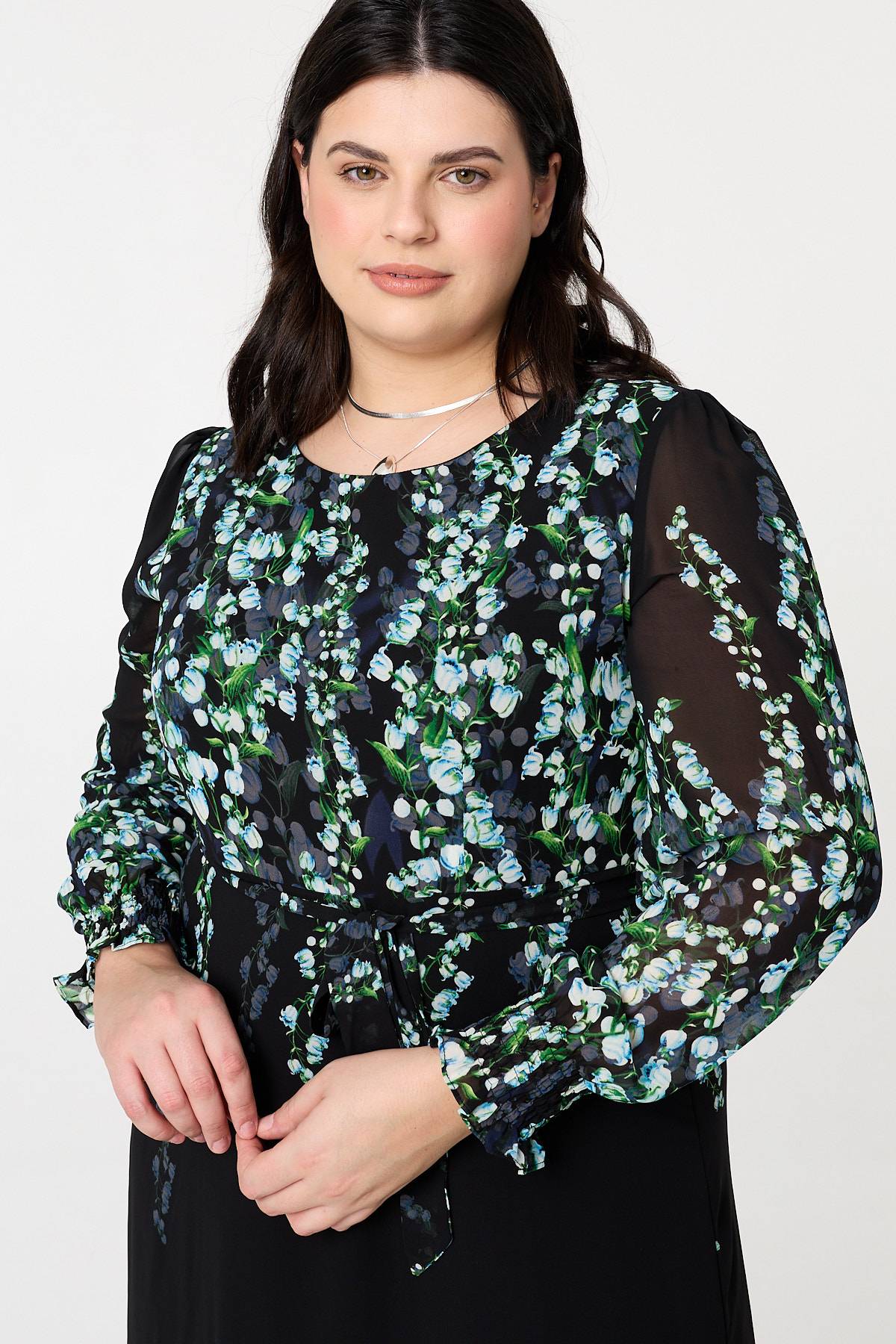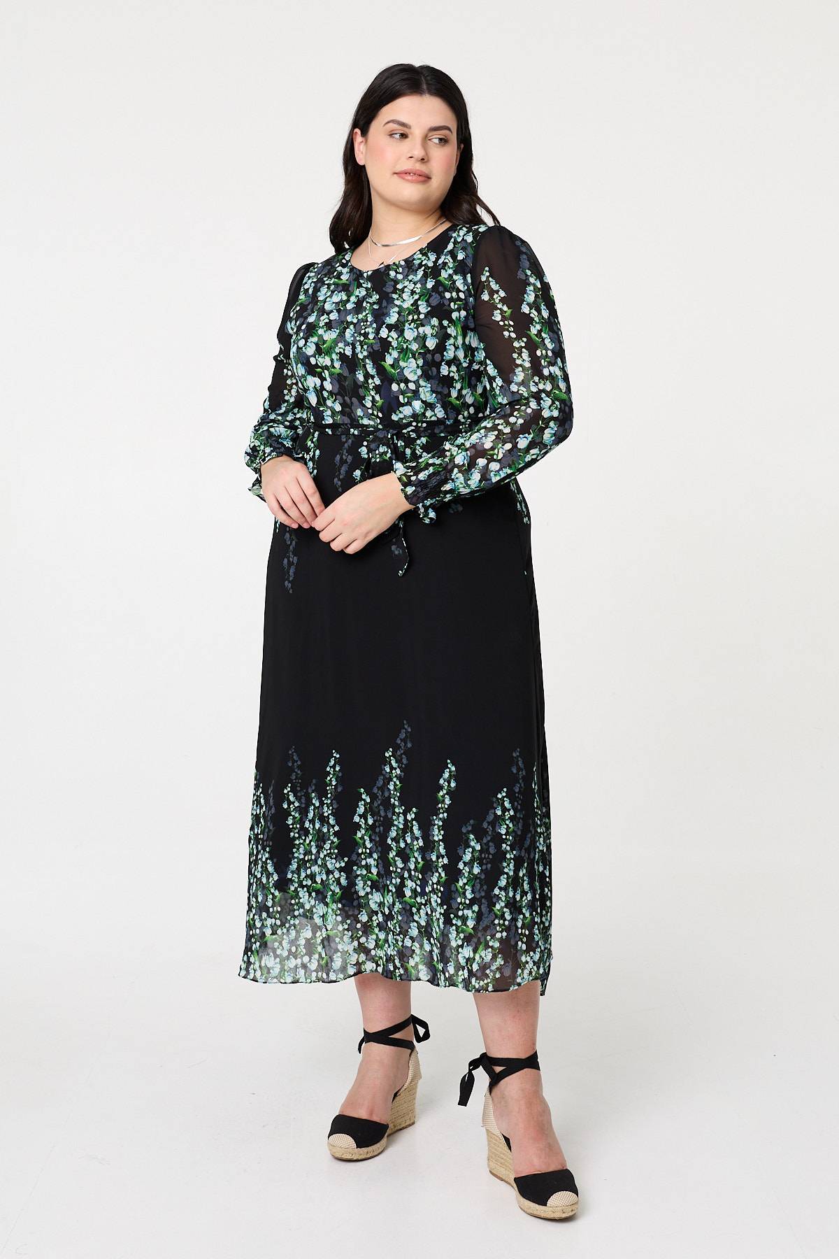 Dress for special occasions in this beautiful maxi dress. It features a round neck, long balloon sleeves and a semi sheer layered texture. Fasten with the adjustable tie belt for the perfect fit. Style with sandals for a daytime event, or elevate the look with pointed heels for an evening invite.