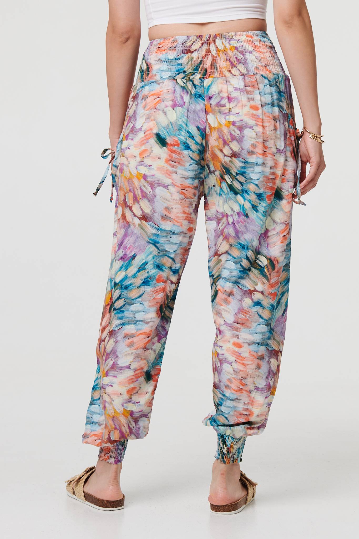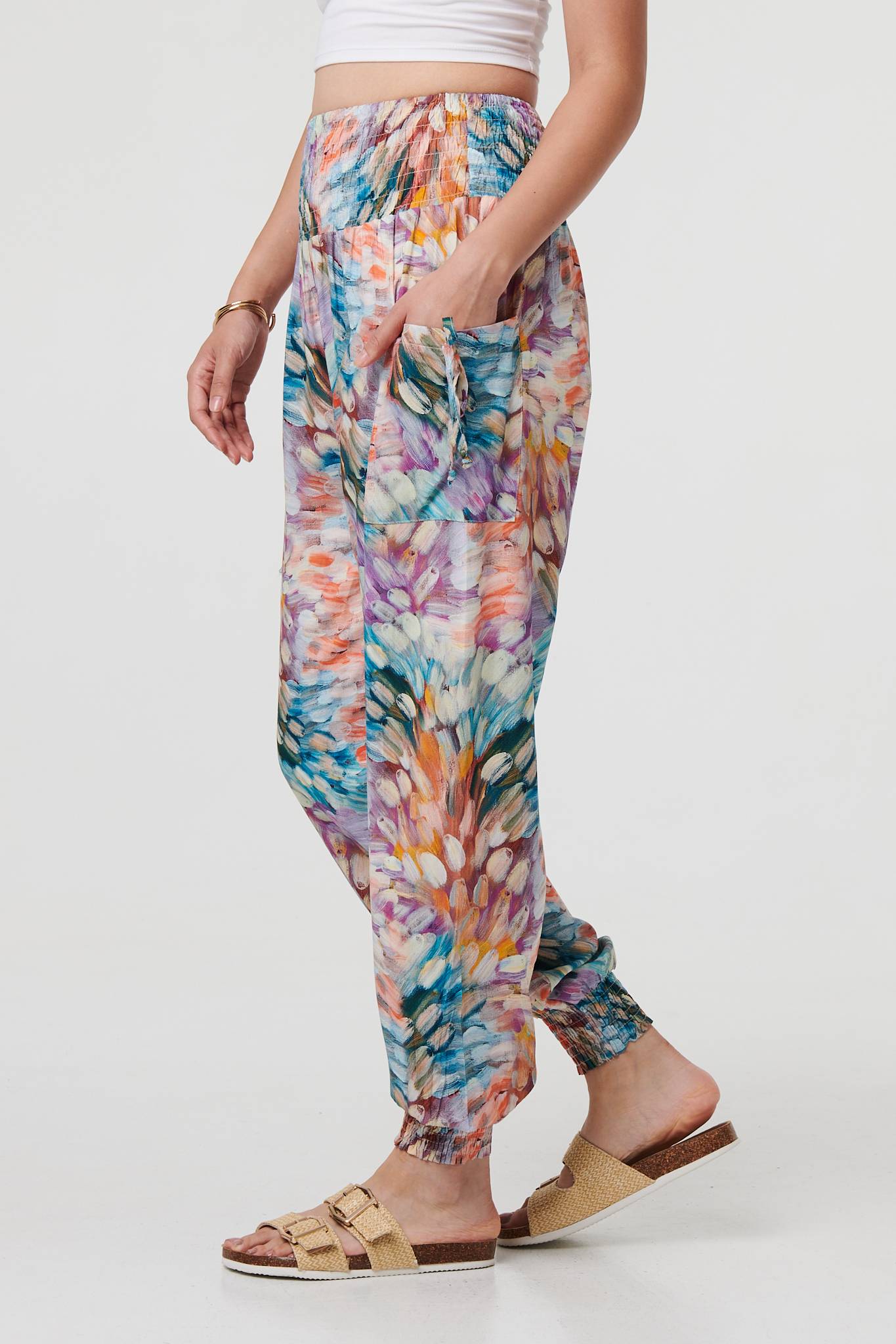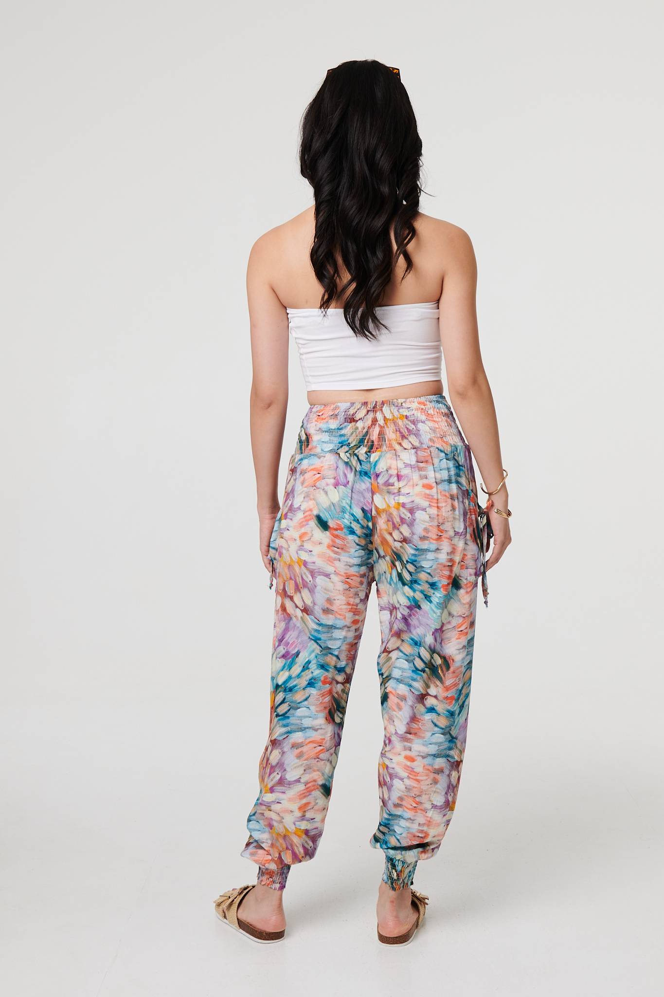 For a relaxed look and a comfy fit, look no further than these harem pants. They have a super-stretchy shirred high waist, with tapered wide legs and cuffed ankles. They also feature handy pockets with tassel details. Complete the look with a simple top or t-shirt.