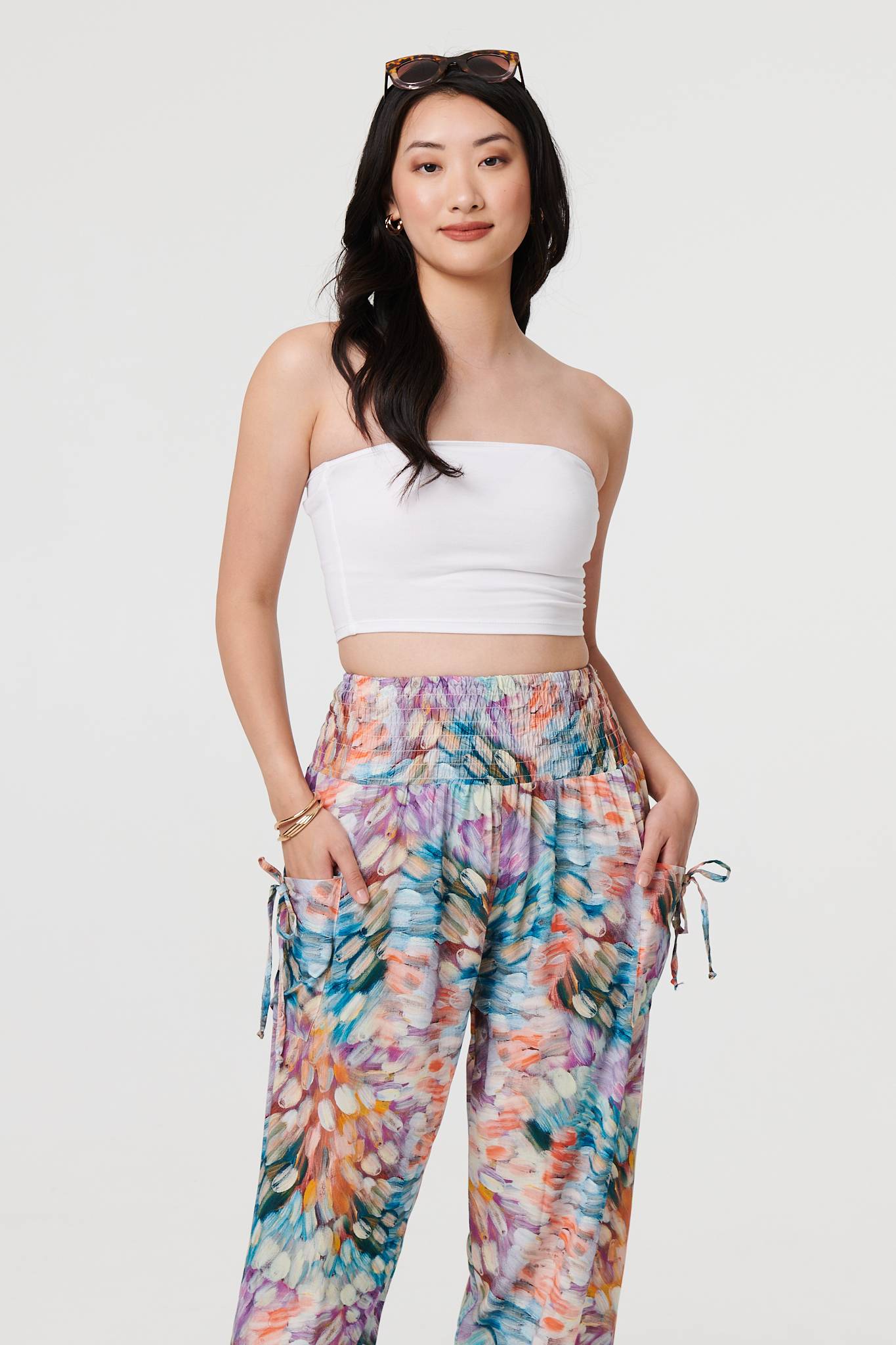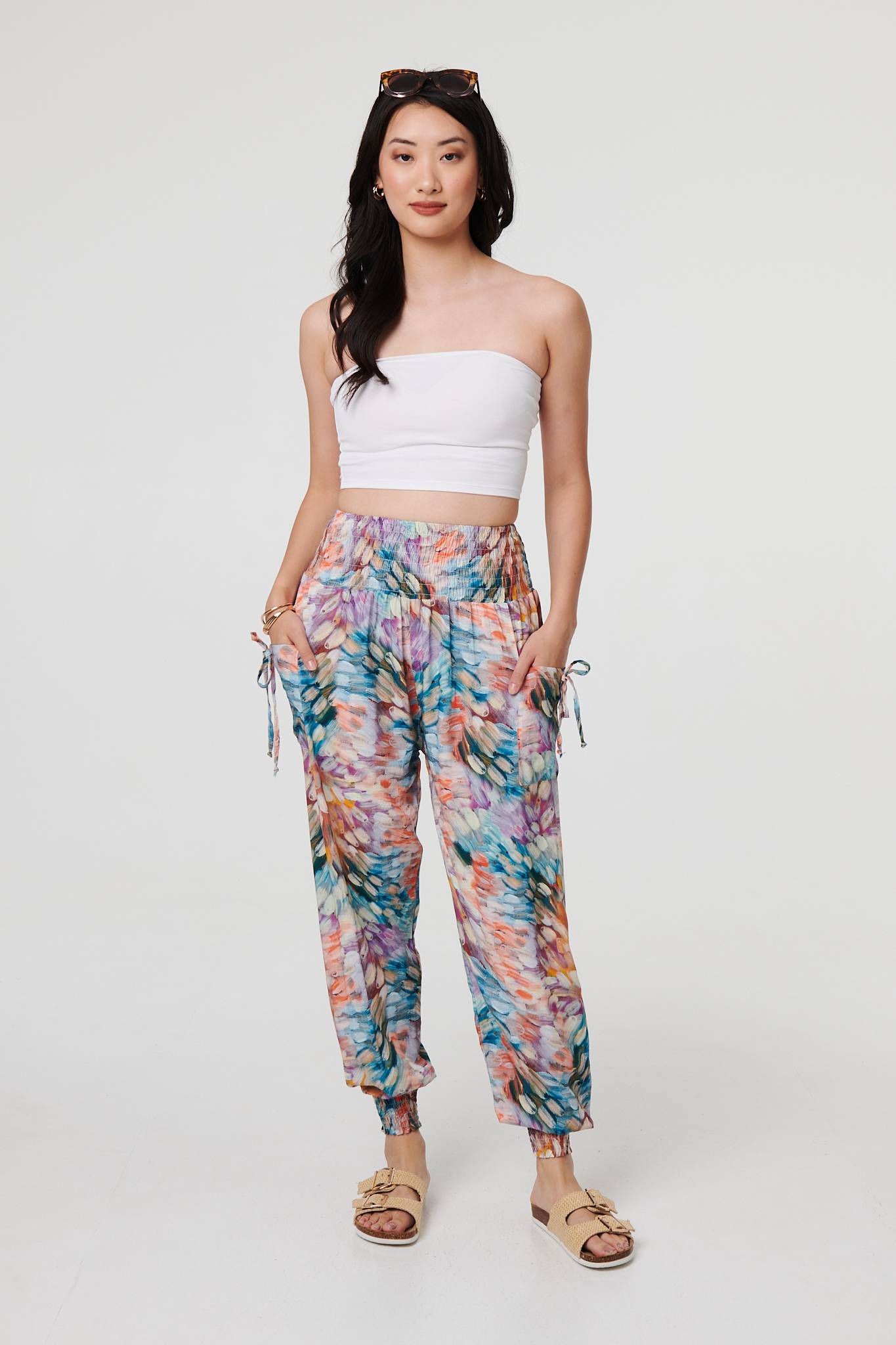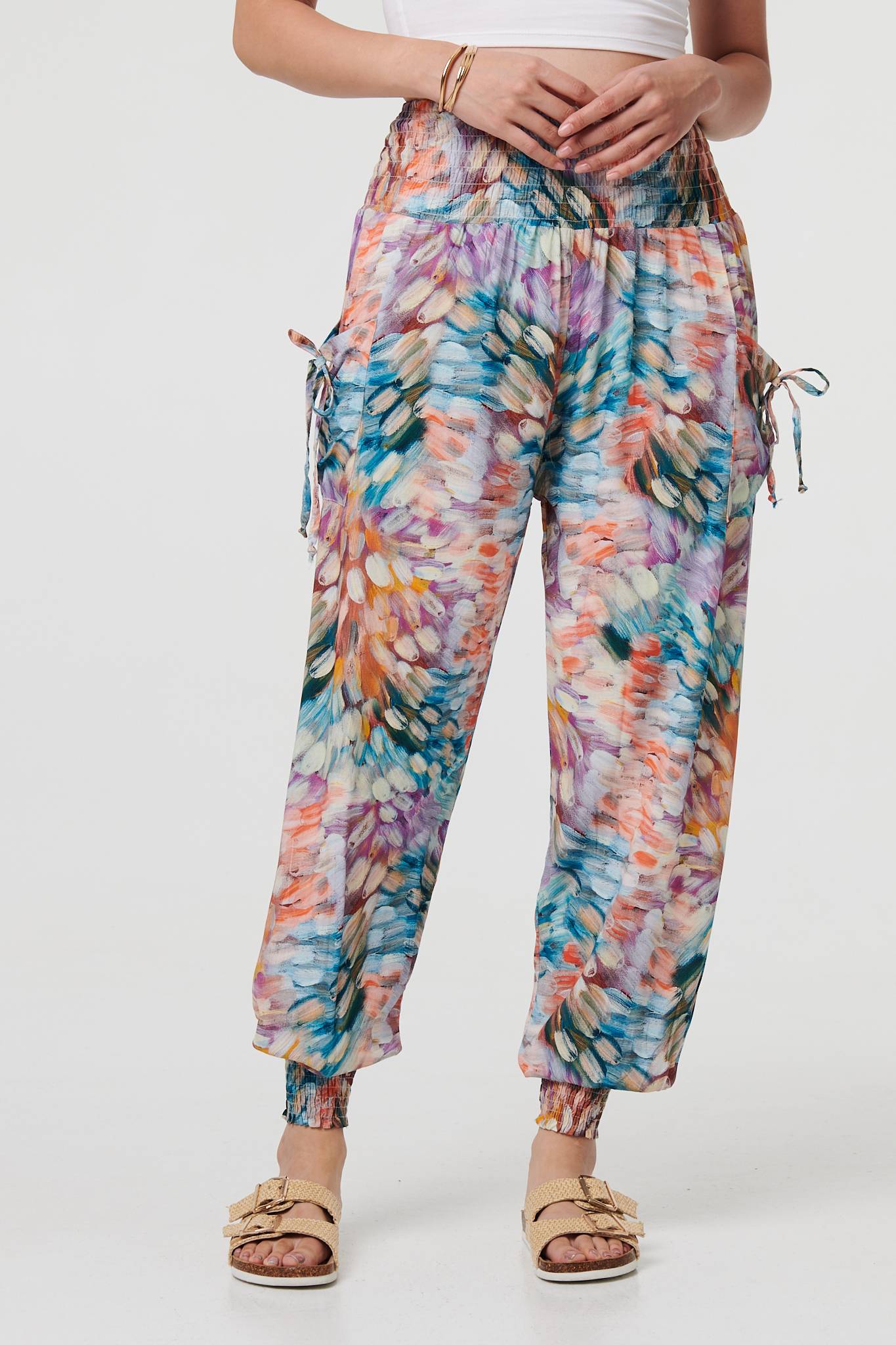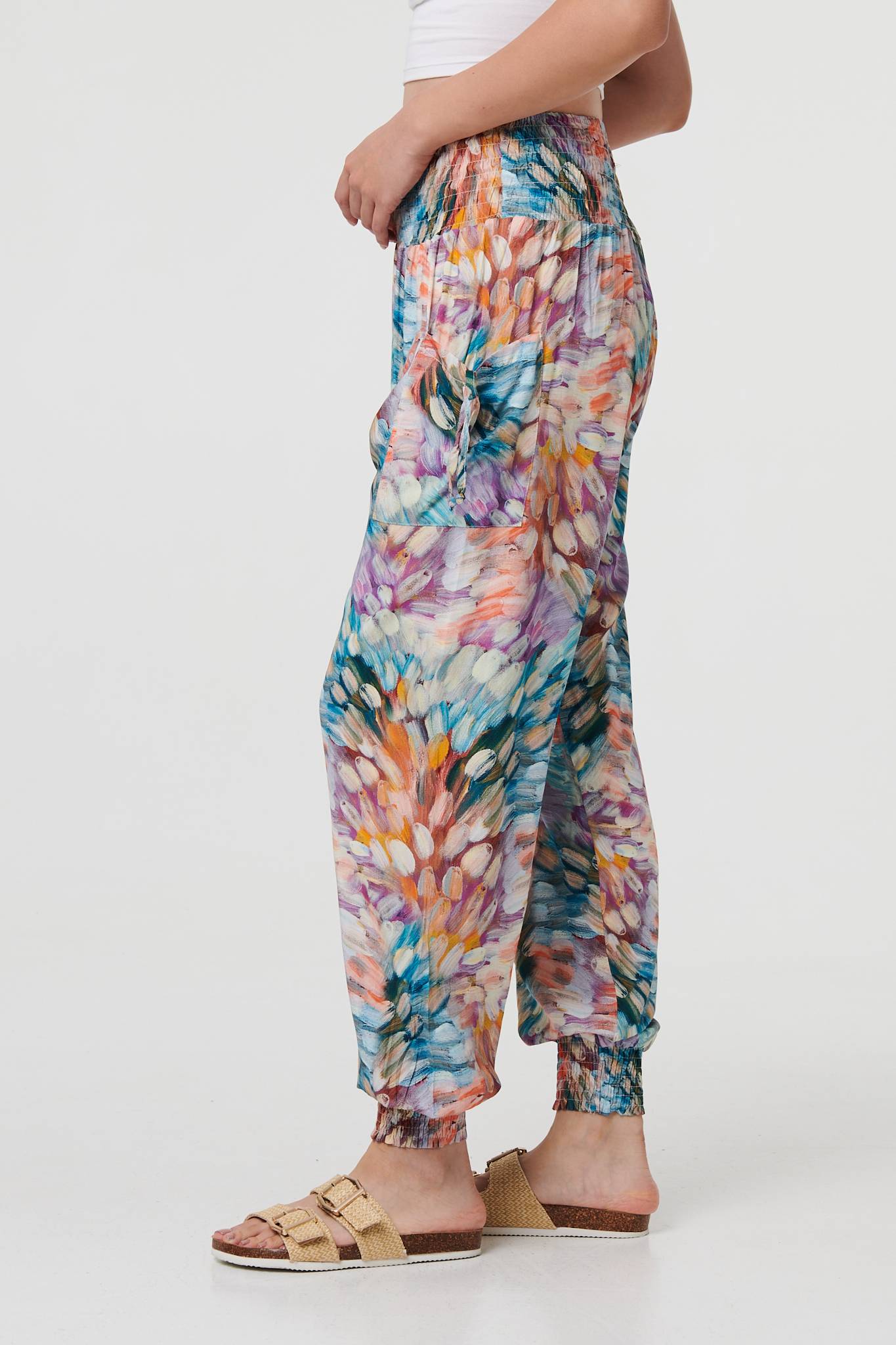 For a relaxed look and a comfy fit, look no further than these harem pants. They have a super-stretchy shirred high waist, with tapered wide legs and cuffed ankles. They also feature handy pockets with tassel details. Complete the look with a simple top or t-shirt.
