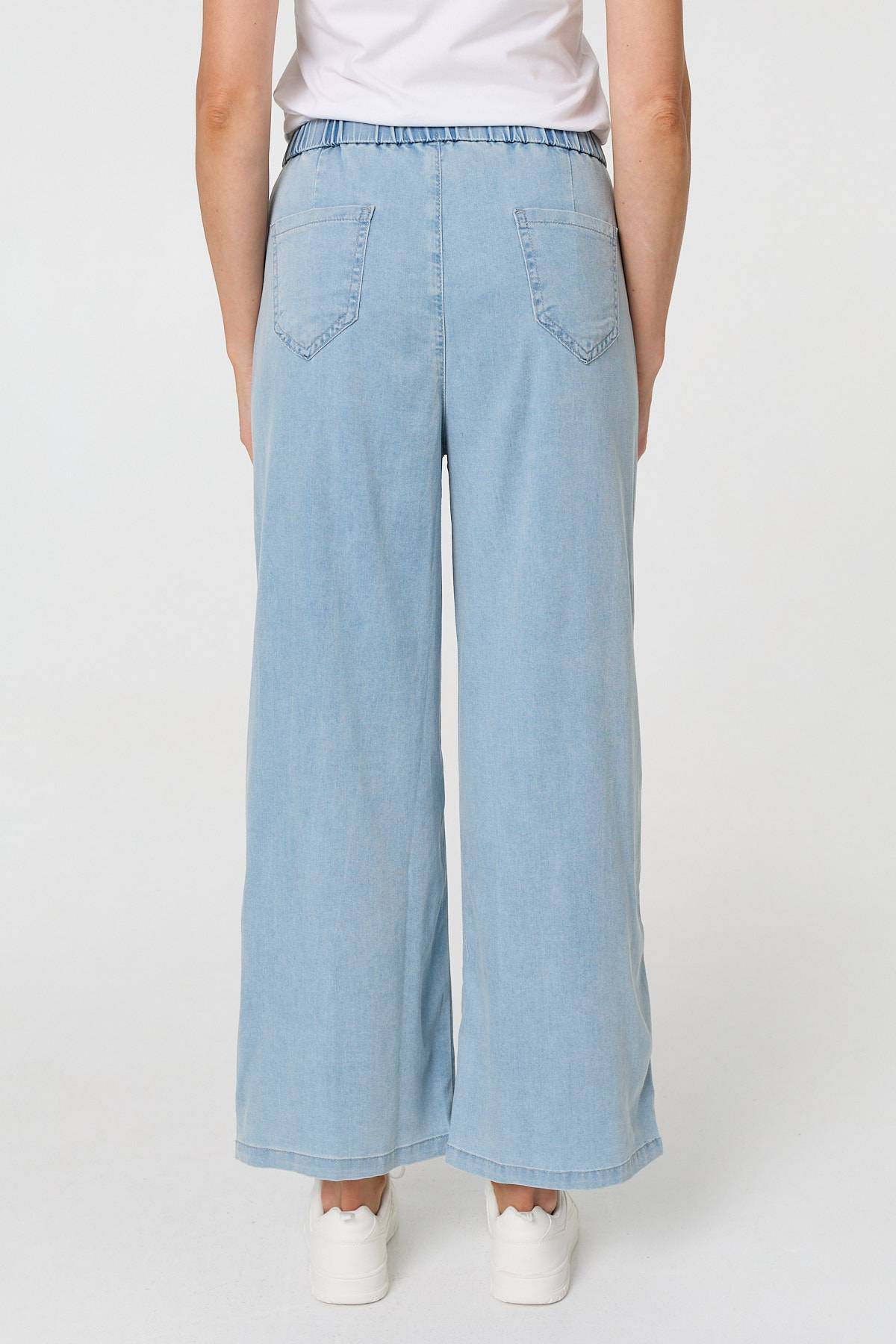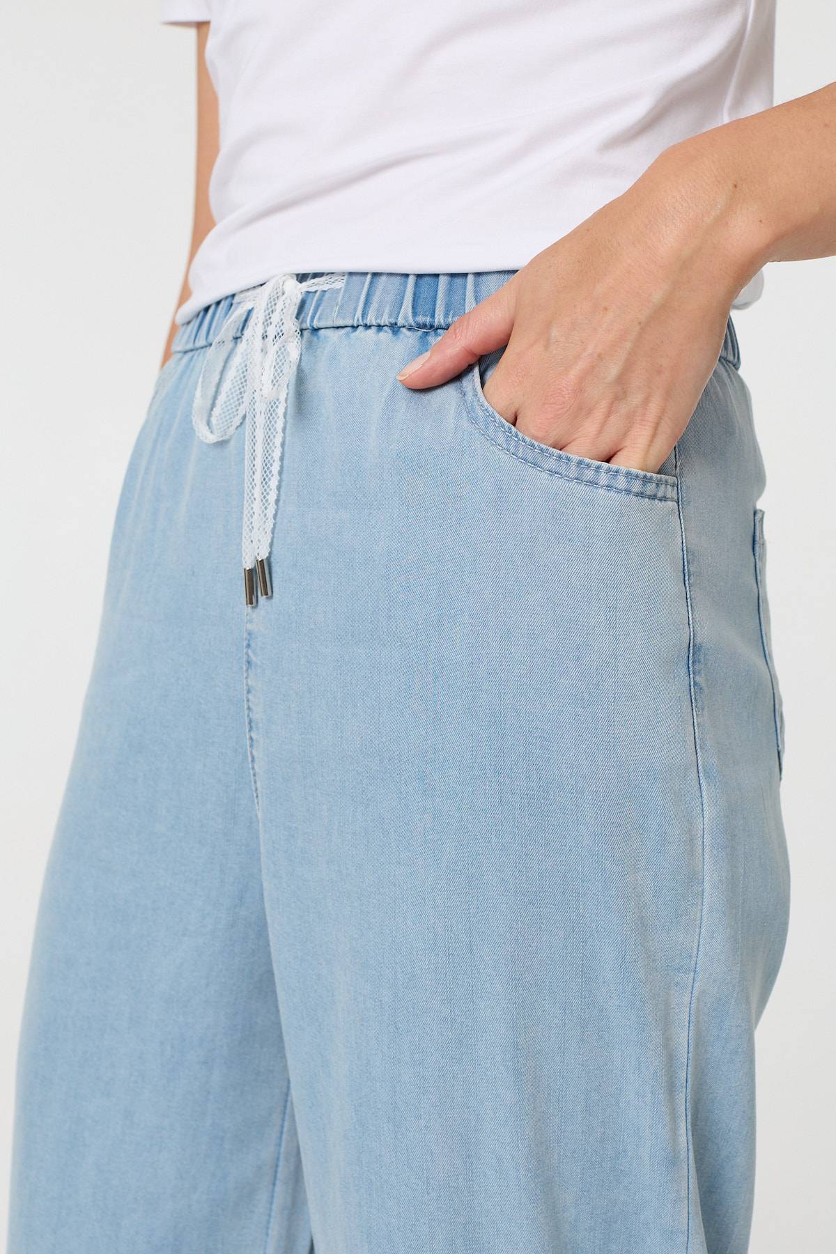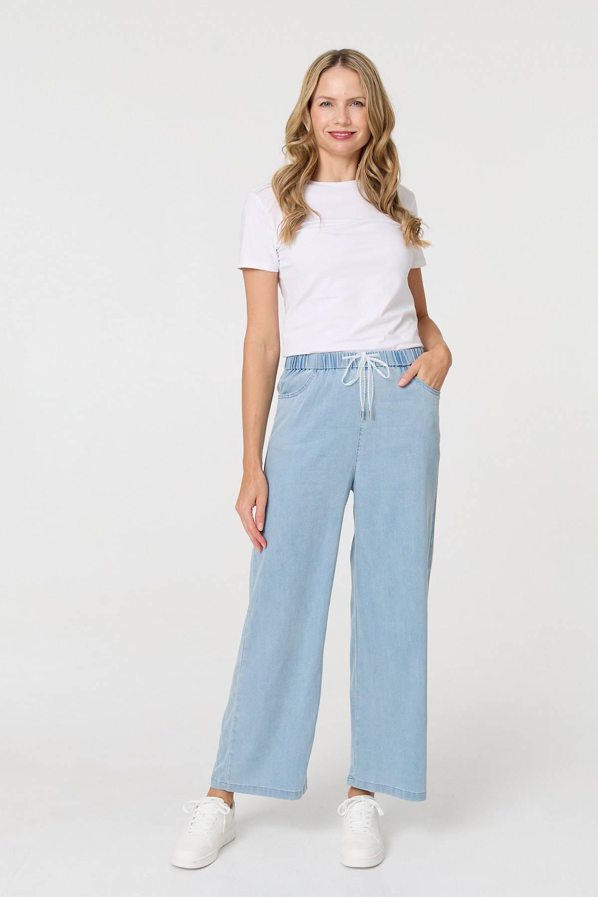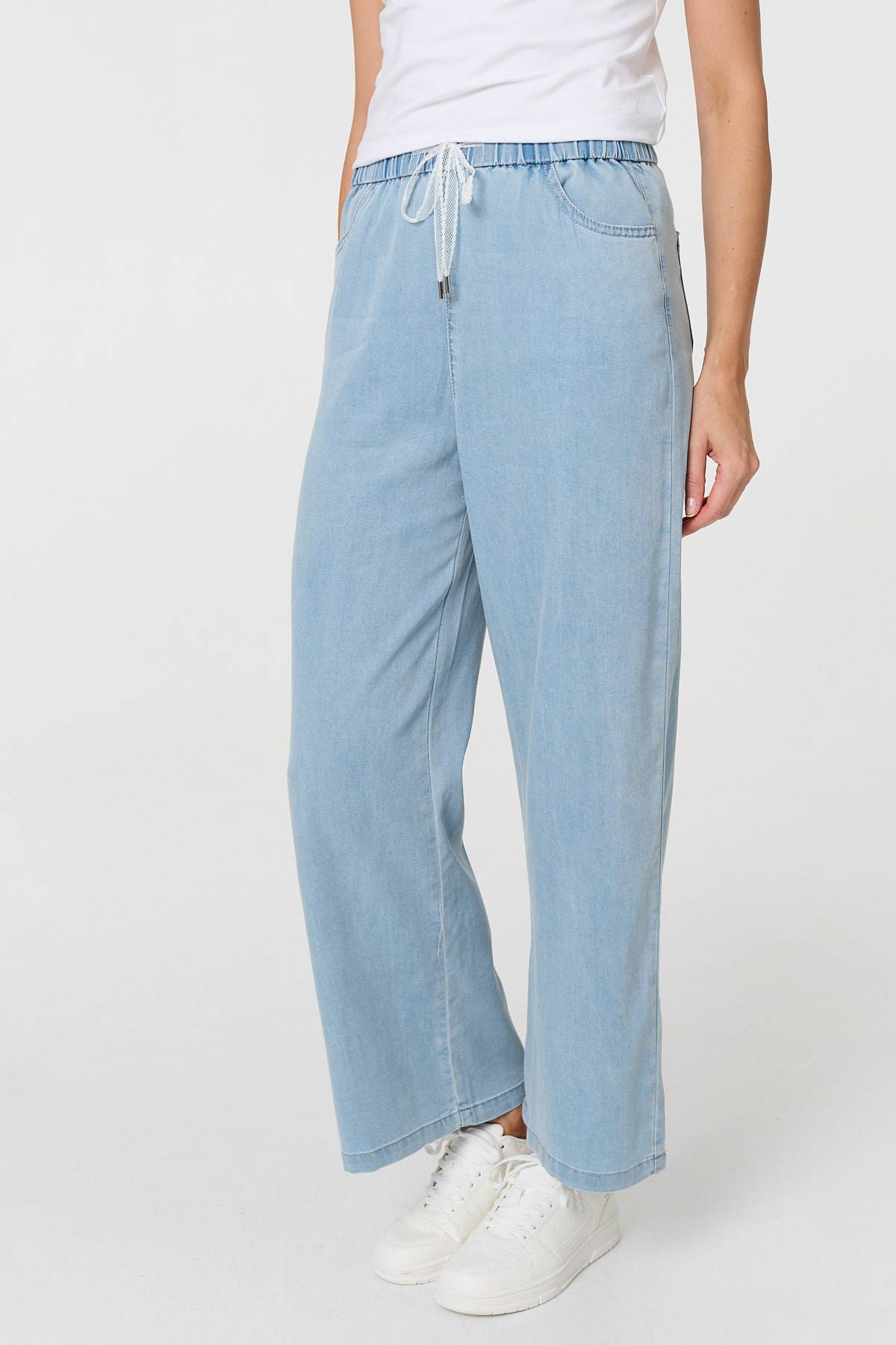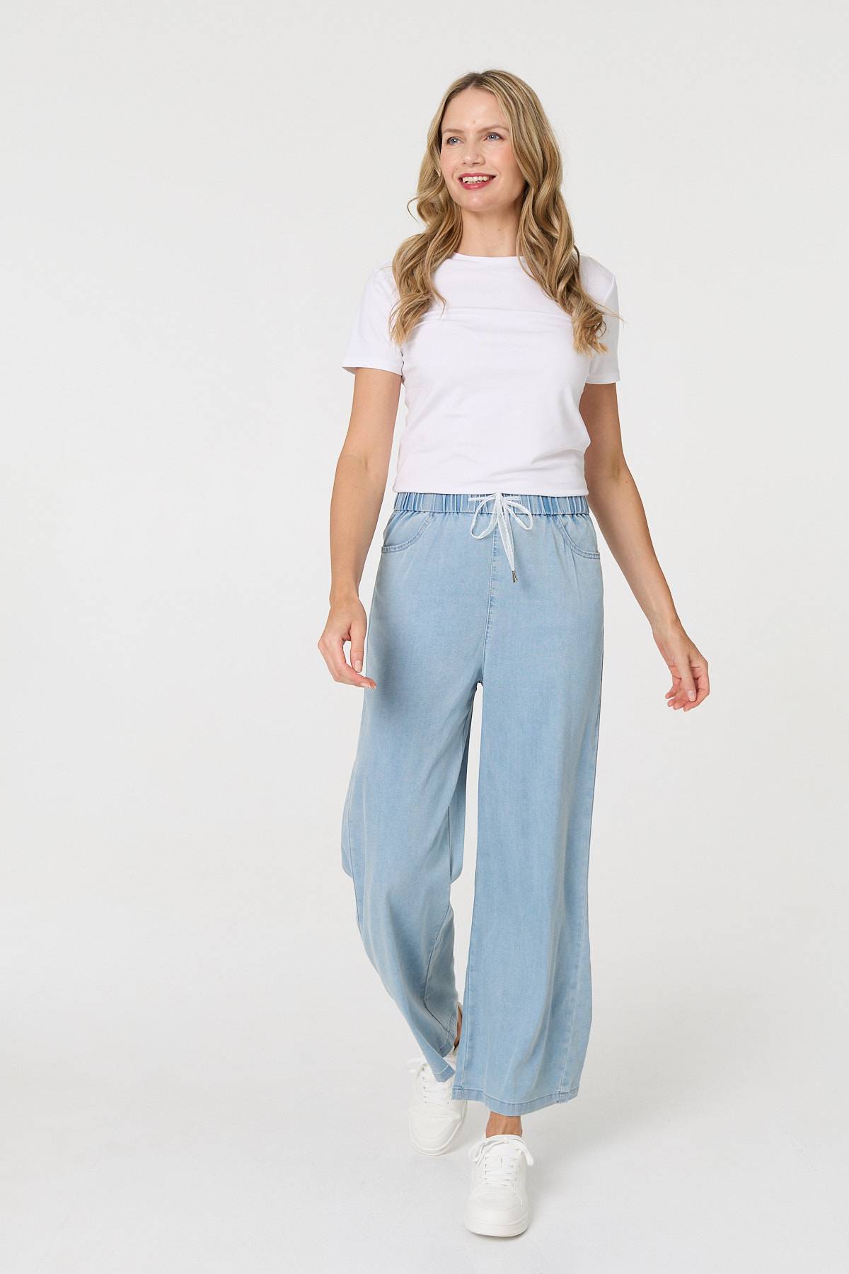 Get a relaxed look with these comfortable trousers. They have a high waist with a tie front detail, along with a stretchy waistband for a comfy fit. They also feature wide legs, full length hems and handy pockets. Style them with a plain t-shirt or a cami top for a simple-yet-stylish casual outfit.