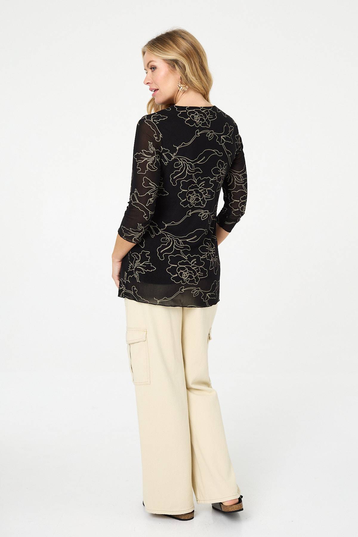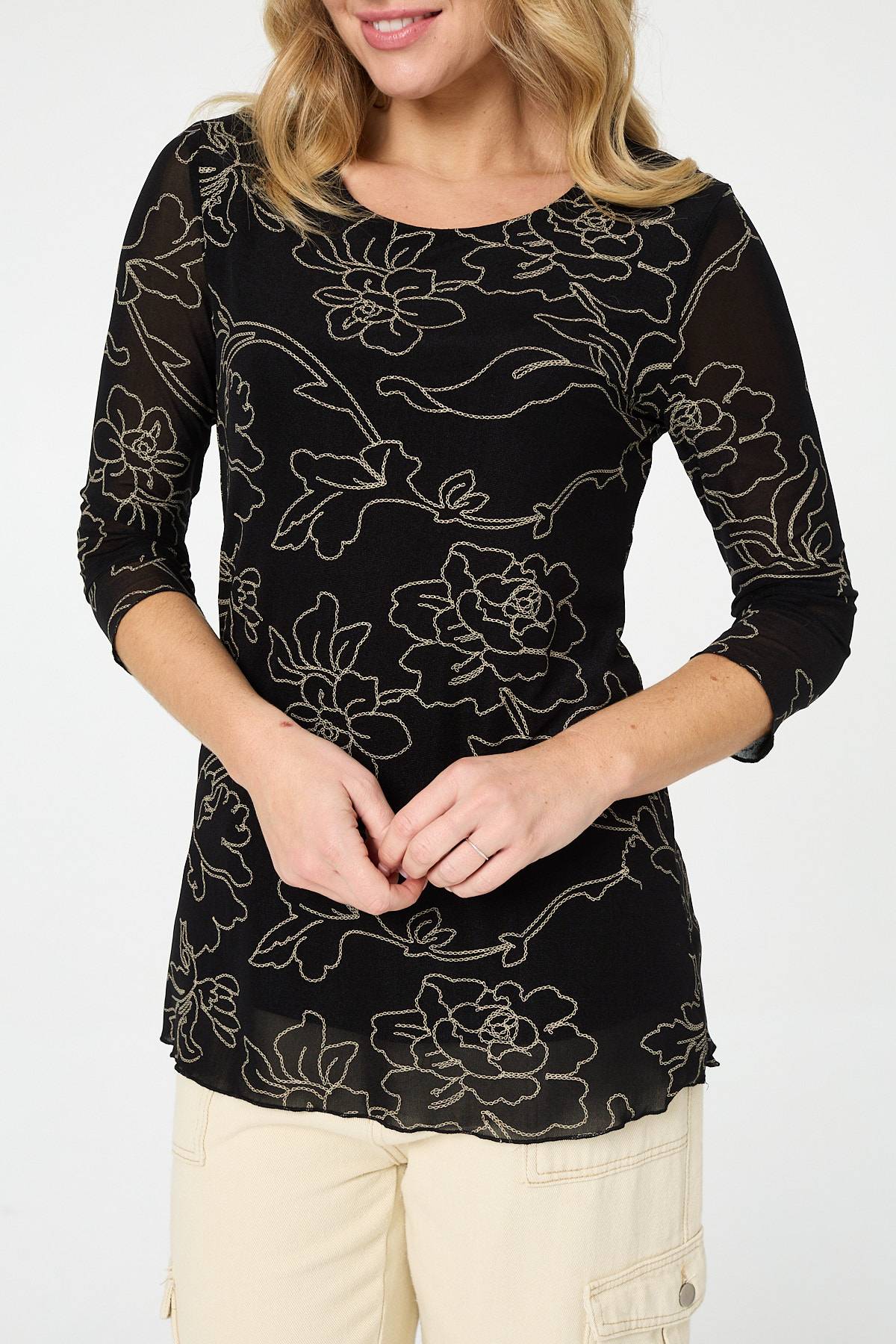 Add this flattering tunic top to your workwear and weekend wardrobe. It has a flattering slim fit with a mesh textured layer, as well as 3/4 semi sheer sleeves. It also features a round neck and a thigh length hem. Wear it with wide leg trousers for an effortlessly smart outfit.