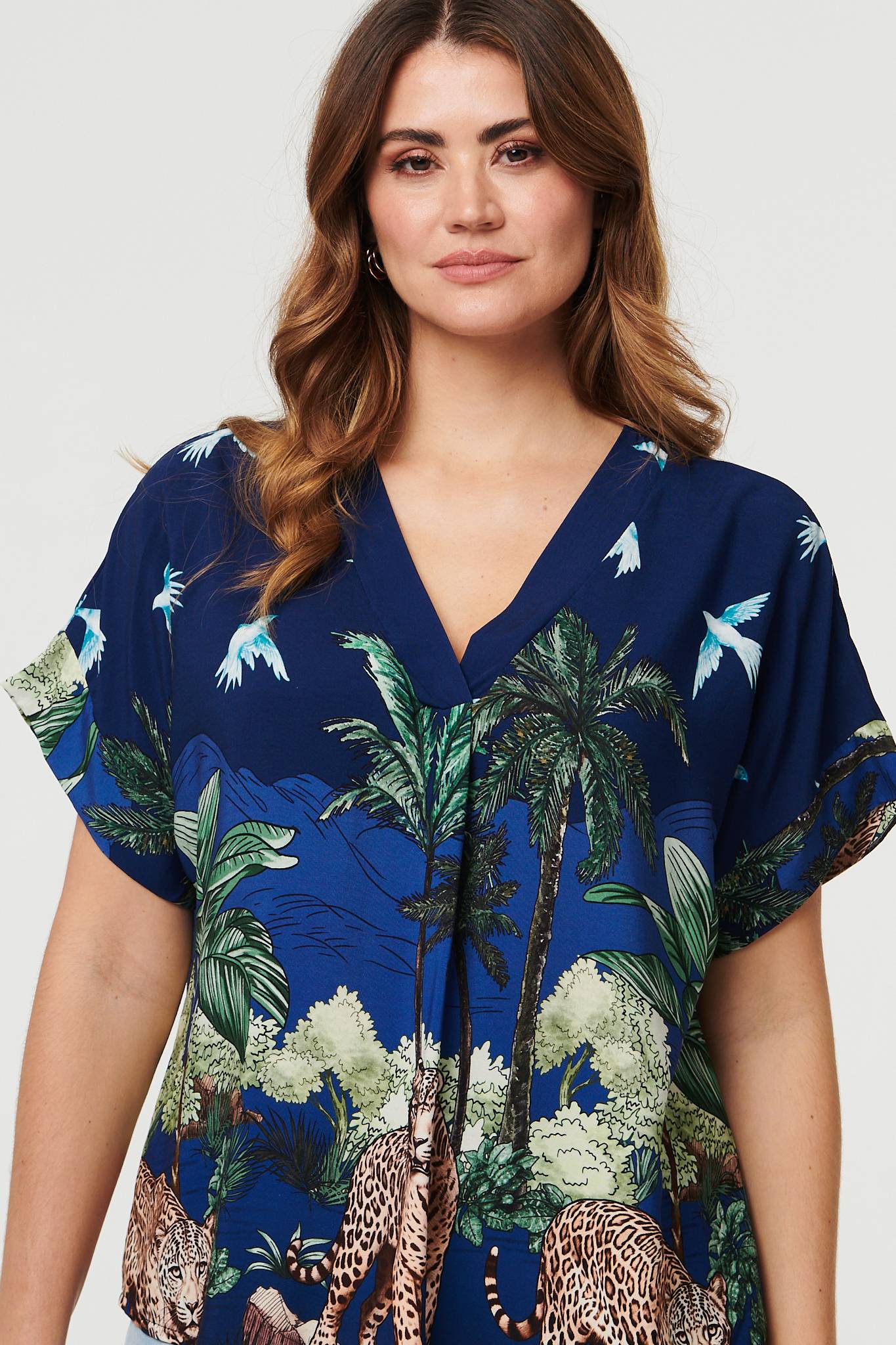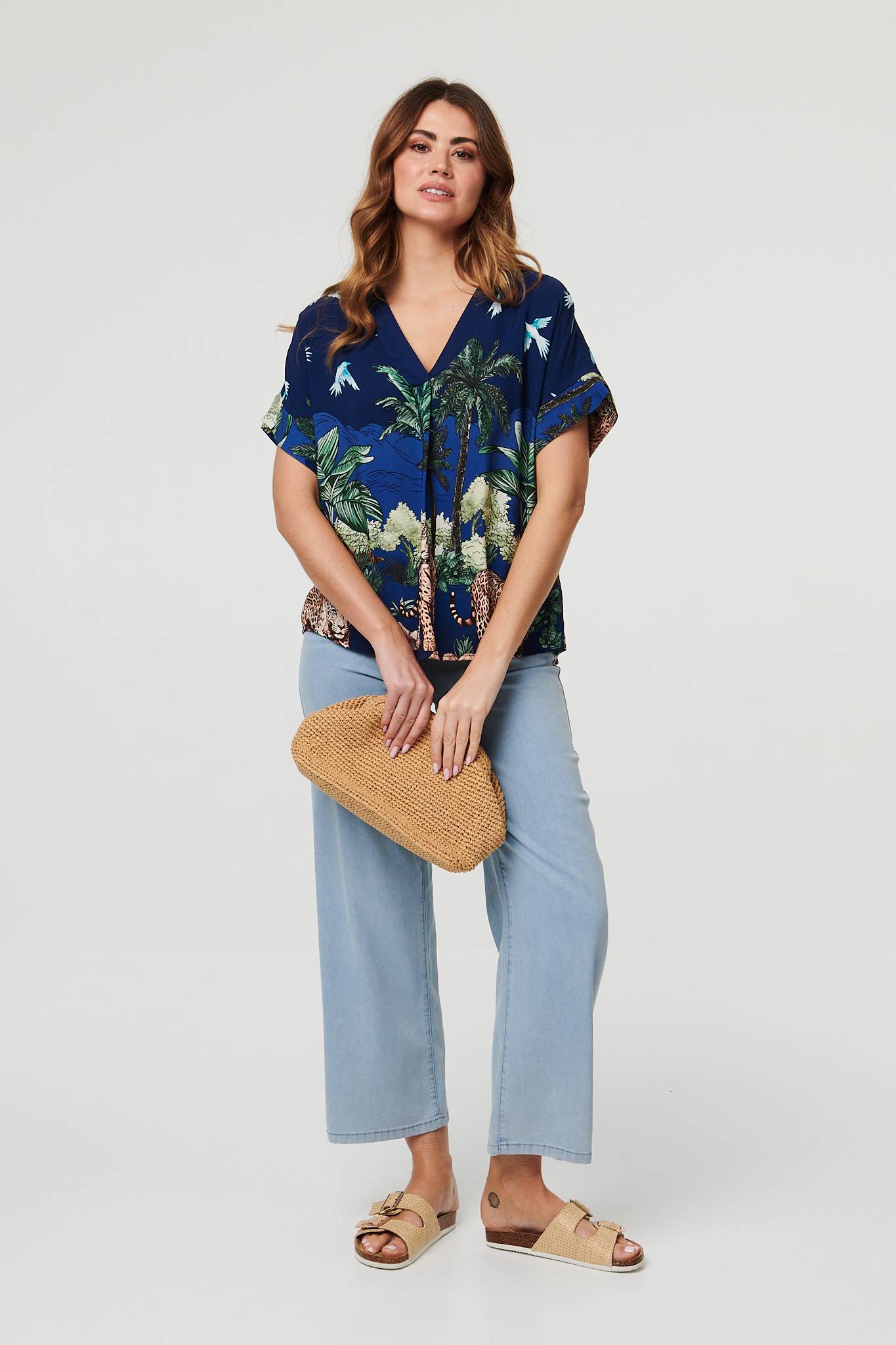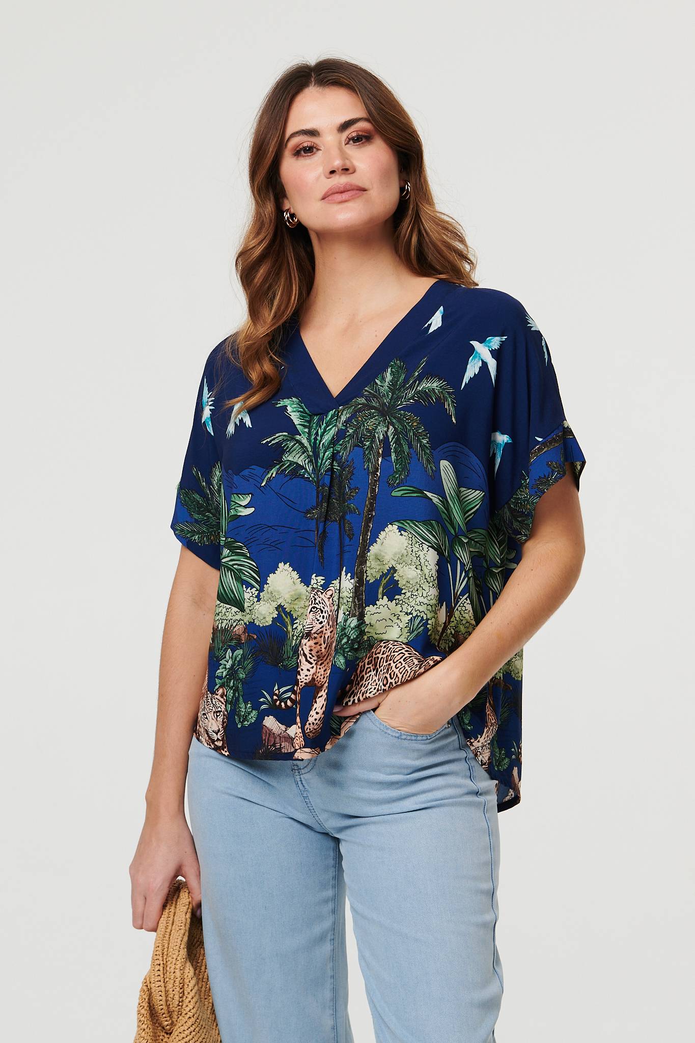 This boxy top has short sleeves, a v-neck and a relaxed fit. It features a hip length hem and layers perfectly over your waistband for a laid-back look at work or on the weekend.