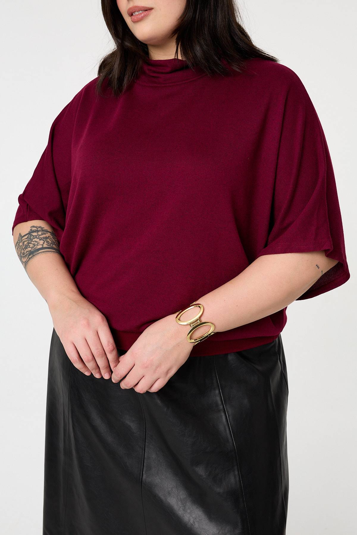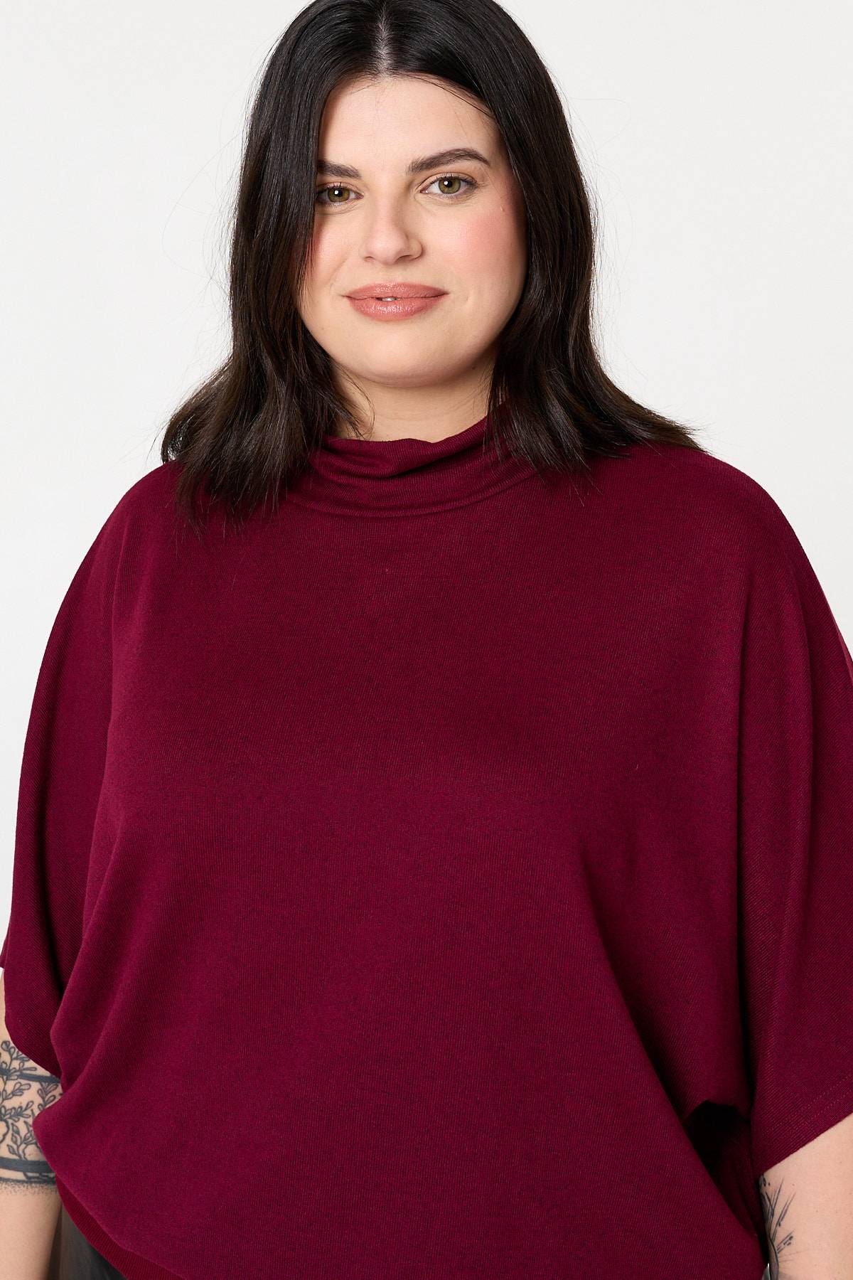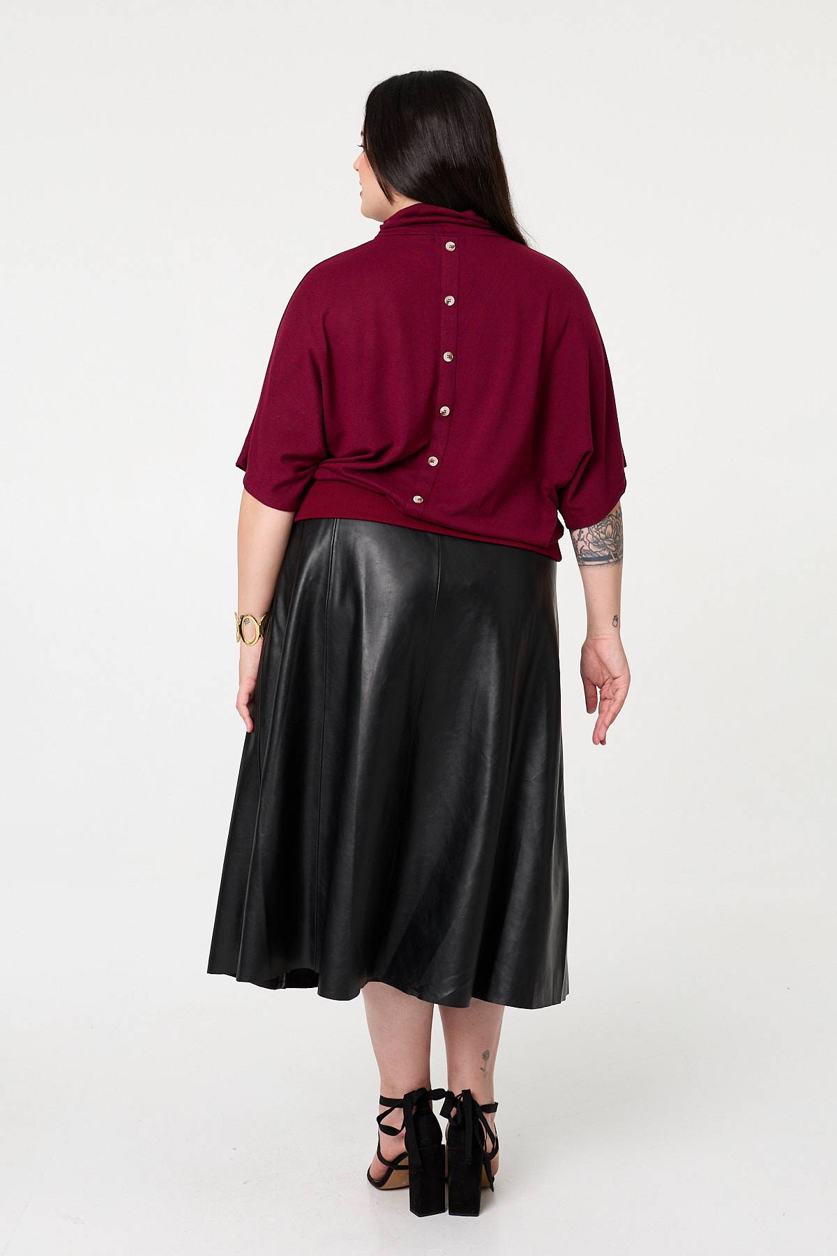 Get a comfortable look with this relaxed textured top. It has a cosy high neck, along with 1/2 batwing sleeves and button details on the back. Style with your favourite comfy jeans for a casual look, or layer over faux leather for a smart outfit.