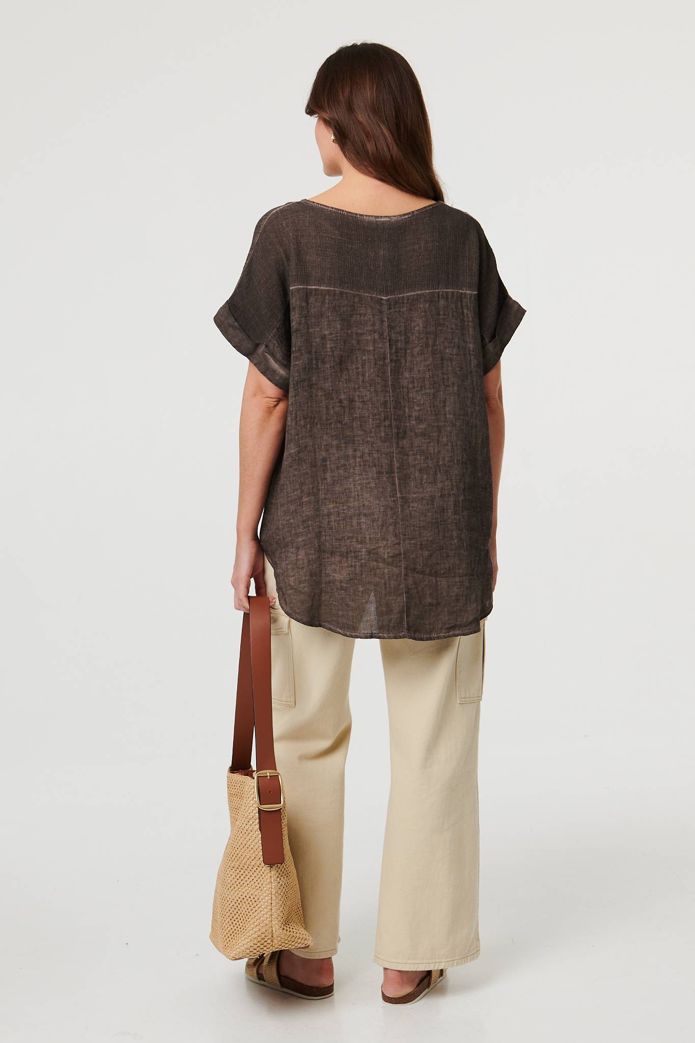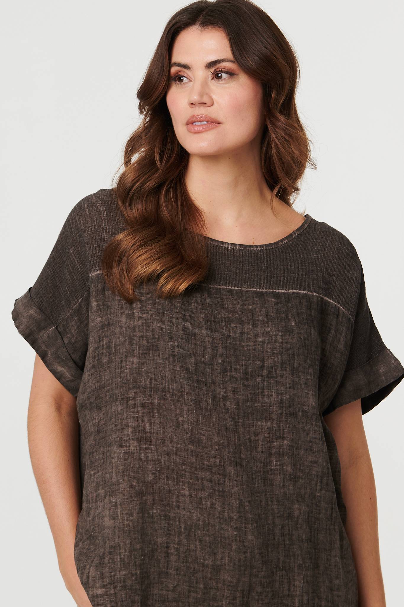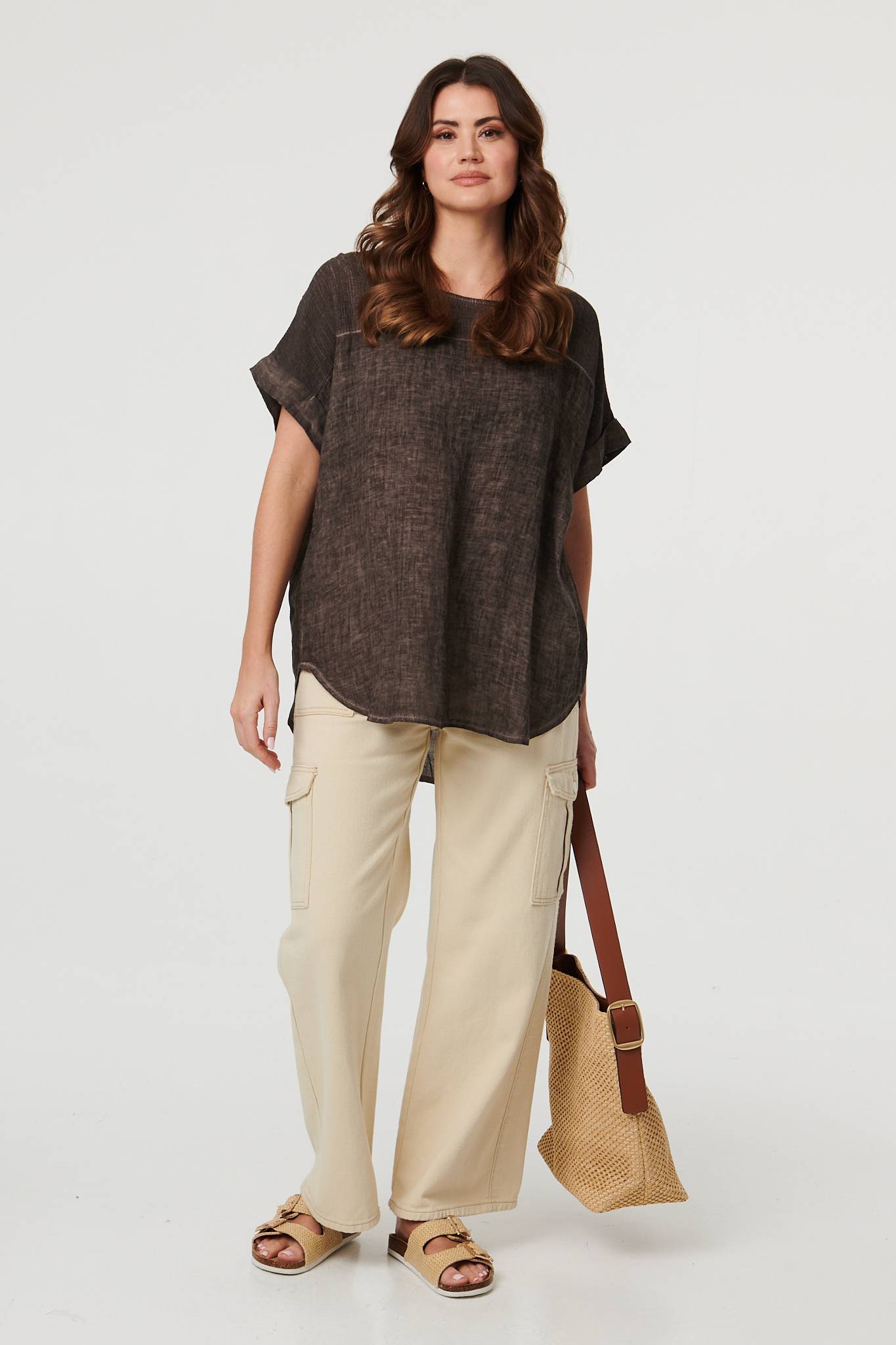 This relaxed top is sure to become a new favourite for your work and weekend outfits. It has short sleeves, a round neck and a thigh length hem. The comfortable soft texture means this top is breathable enough to layer up.